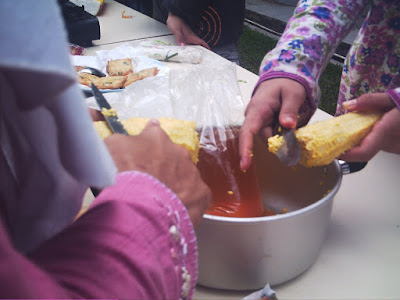 unqonex kebagian sesi pertama (jadi ada dua sesi, soalnya kalo' semua kelas masak gak cukup peralatannya). kelas aku pertamanya bingung mau masak apa dengan menu utamanya jagung (bingung jagungnya buat apa nih), sampe-sampe kita nanya sama bu metig (bu metig-kan suka masak tuh). dan akhirnya kita memutuskan buat masak martabak, itu sih idenya tika (tika telepon ibunya). nida' yang bertugas keluar belanja bahan-bahan buat bikin martabak jagung.